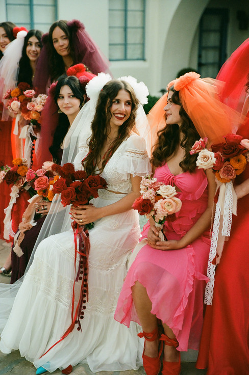The bride and her entourage were a sight to behold. The bride wore a flowing white gown with intricate lace details, perfectly complemented by her long, loose curls and a veil that added a touch of elegance. Her bridesmaids were striking in dresses of red, orange, and pink, each with matching veils and bouquets that added a splash of color.